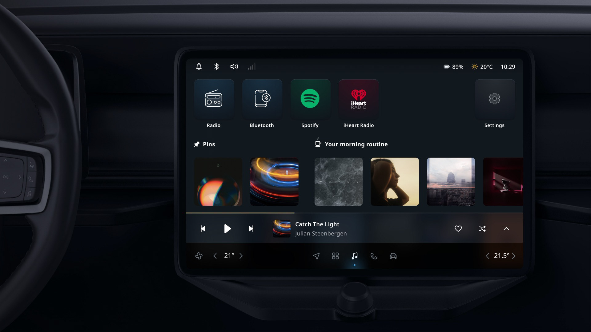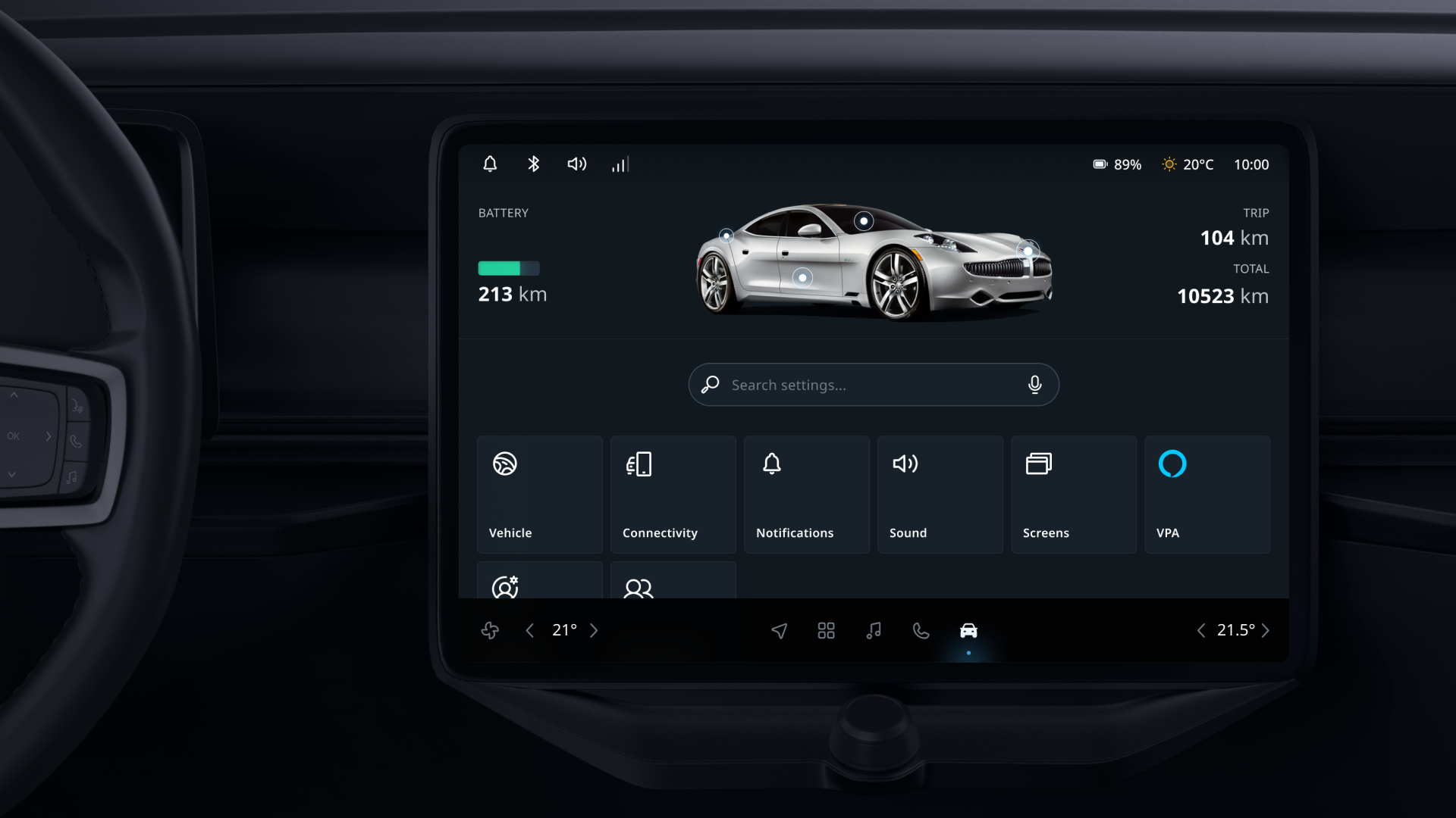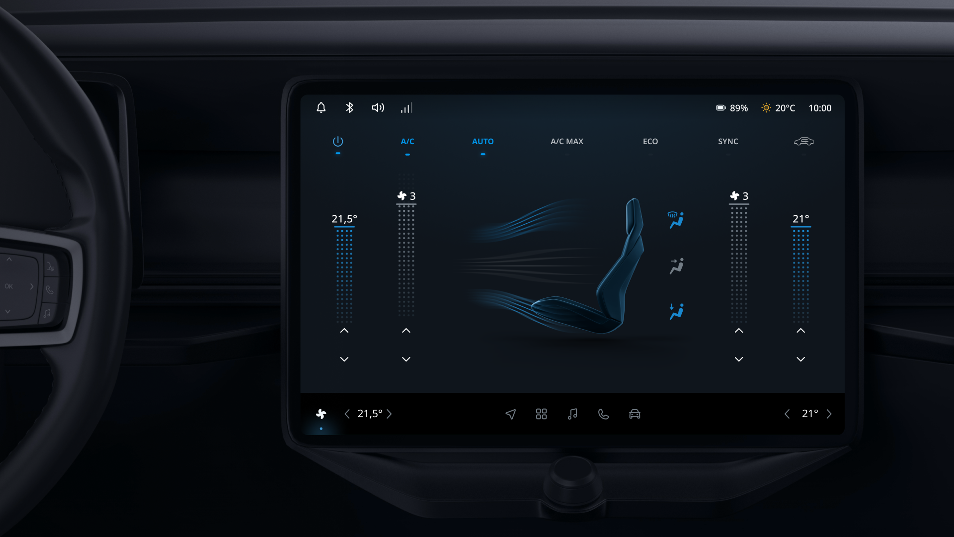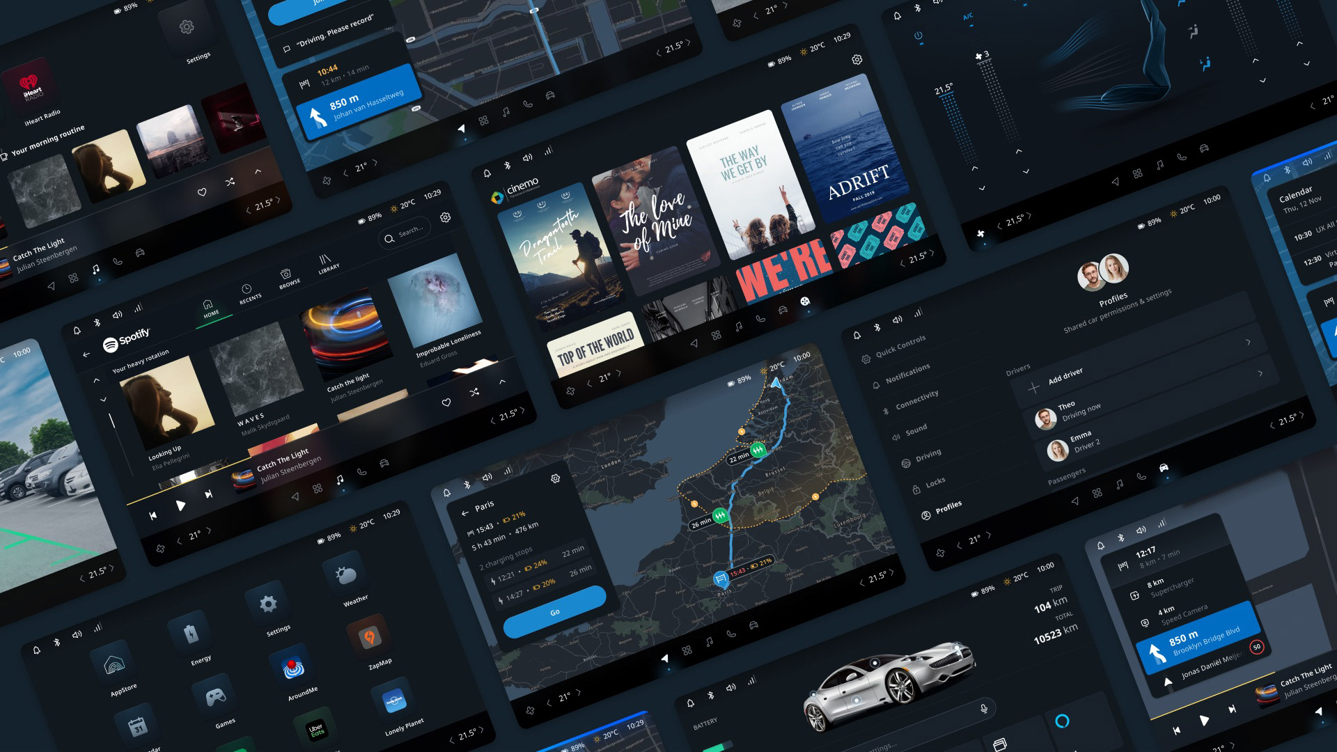 The UX Strategy was to create a seamless and engaging in-car user experience with a voice-first approach, integrating users’ digital lives and ensuring a comprehensive cockpit experience centered on safety. This encompassed everything from the Infotainment system to the Cluster Display and passenger interfaces. It involved the system UI Framework, Notifications, System feedback & Acknowledgments, as well as multimodal interactions like Voice, Focus UI, and touch. We designed key domain applications, including Navigation, Entertainment, Communication, Settings & Personalization, and Climate controls.